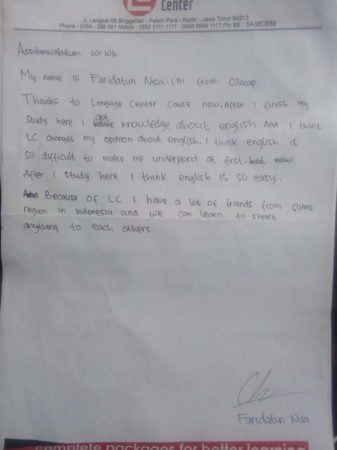 Terimakasih Languge Center karena sekarang setelah masa belajar selesai saya mendapatkan banyak pengetahuan tentang bahasa inggris. Berkat LC saya bisa merubah fikiran mengenai bahasa inggris. Awalnya saya fikir bahasa inggris itu sangat sulit untuk dipahami, tetapi setelah belajar di sini saya merasa bahasa inggris lebih mudah untuk dipelajari.