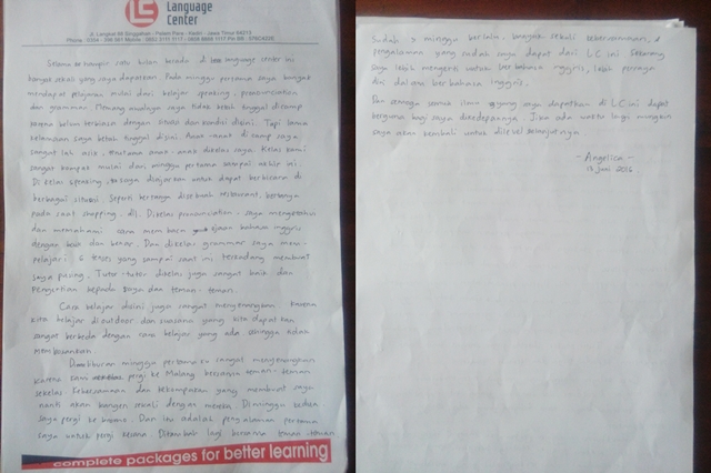 Sudah tiga minggu berlalu, banyak sekali kebersamaan dan pengalaman yang sudah saya dapat dari LC ini. Sekarang saya lebih mengerti untuk berbahasa Inggris, lebih percaya diri dalam berbahasa Inggris. Dan semoga semua ilmu yang saya dapatkan di LC ini dapat berguna bagi saya kedepannya. Jika ada waktu lagi mingkin saya akan kebali untuk melanjutkan ke level selanjutnya.